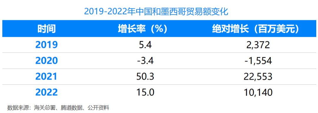 2019年至2022年,墨西哥与中国的贸易以年均15.2%的速度增长,中国已经成为墨西哥在全球第二大贸易伙伴,在亚太地区第一大贸易伙伴,同时中国也是墨西哥第二大进口来源国和第三大出口市场,2022年,中墨贸易总额为949.65亿美元,同比增长9.8%,中方出口775.35亿美元,同比增长15.1%。