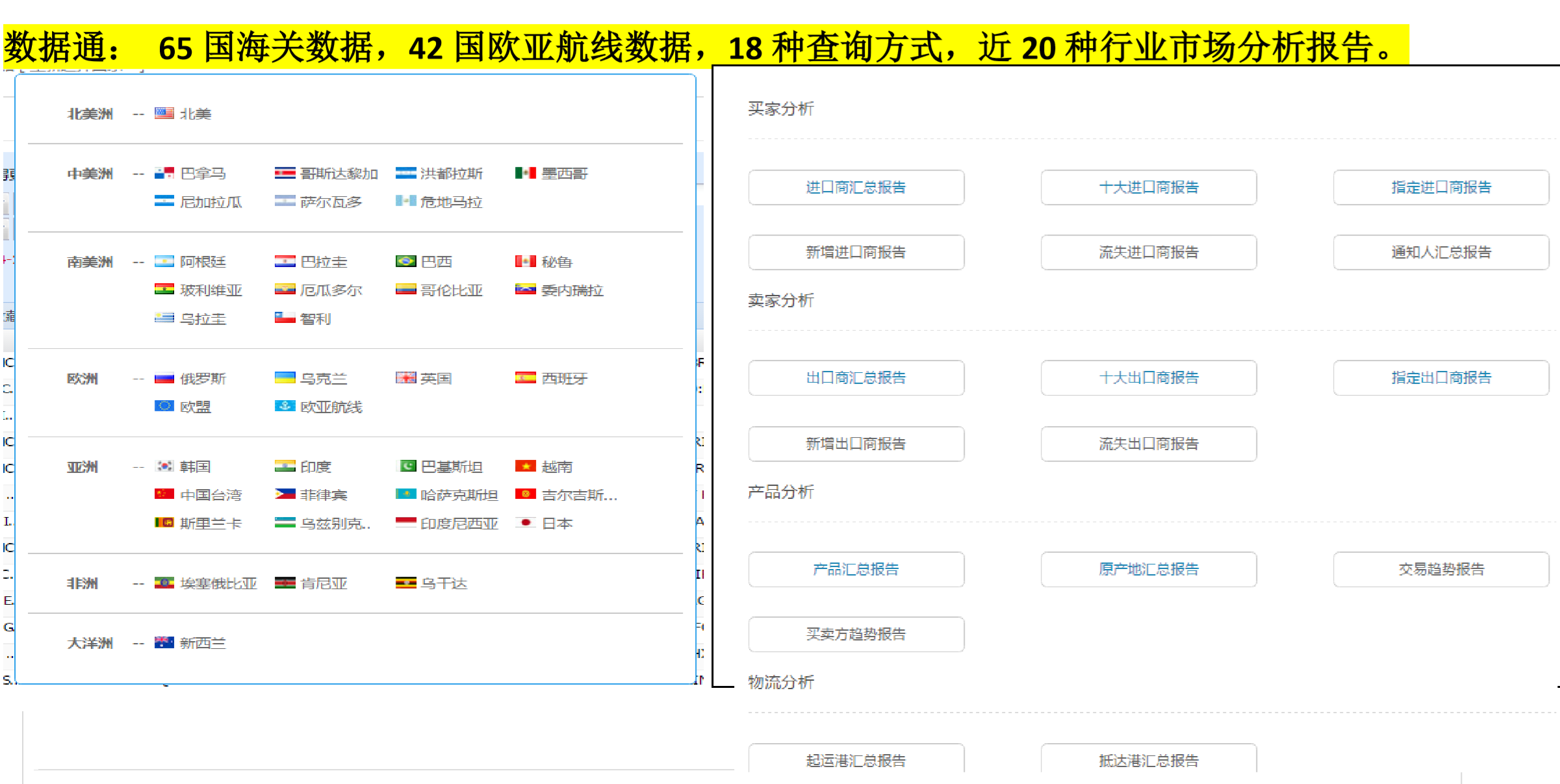 dcbox小金库海关数据库,实时给予全球涵盖65国海关数据,42国欧亚航线数据,100+亿实时贸易数据,定位1.8亿全球企业信息,帮助您分析全球市场贸易趋势及分布,为您的产品快速、精准、科学地锁定热销国家和新兴市场。