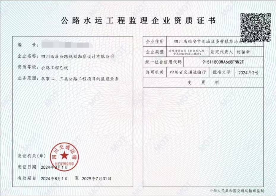 近期,经四川省交通运输厅批准,瓦力棋牌(中国)集团勘察设计公司成功取得公路工程监理乙级资质,该资质的成功获批,标志着我公司业务迈向新领域。
