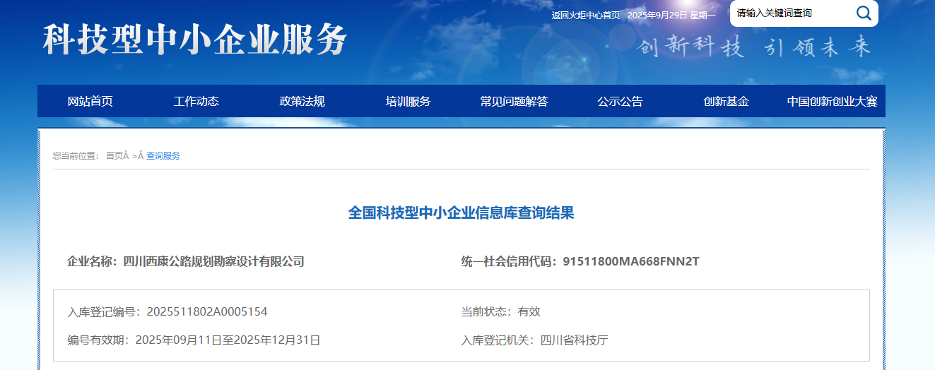 近期,四川省科研技术厅公布本年度第二批科技型中小企业名单,四川西康公路规划勘察设计有限公司再获“科技型中小企业”认定,这一荣誉体现了公司在科技创新开展道路上的持续进步与实力积淀。