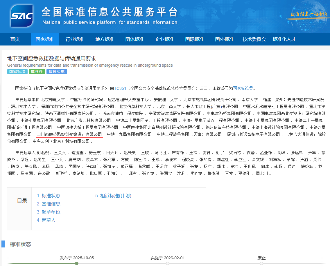 近期,由四川西康公路规划勘察设计有限公司参与编制的推荐性国家标准GB/T 46338-2025《地下空间应急救援数据与传输通用要求》经国家标准委批准正式发布,将于2026年2月1日起正式实施。