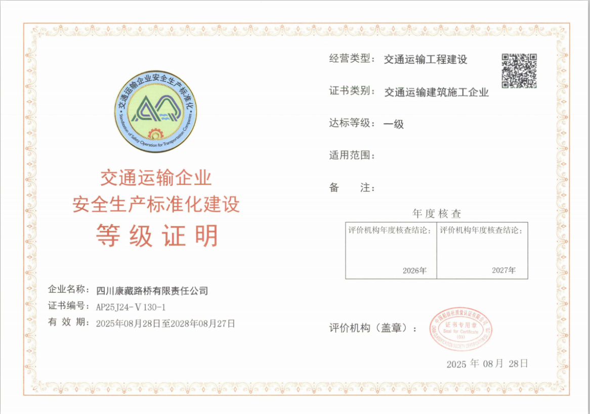 近期,经交通运输部交通运输企业安全生产标准化评价机构综合评定,康藏路桥公司获评安全标准化一级企业并取得证书,标志其安全生产管理体系获国家最高标准认可。