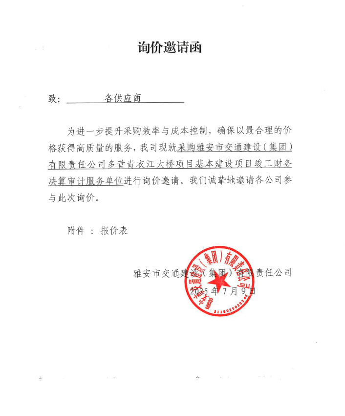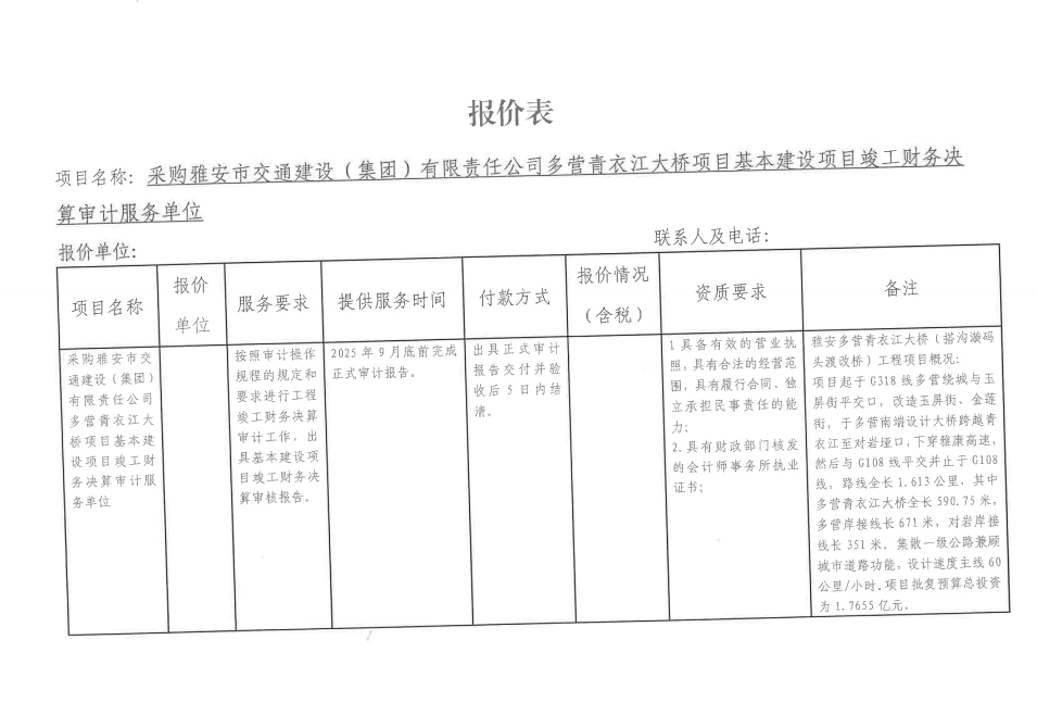 询价邀请函——采购雅安市交通建设(集团)有限责任公司多营青衣江大桥项目基本建设项目竣工财务决算审计服务单位