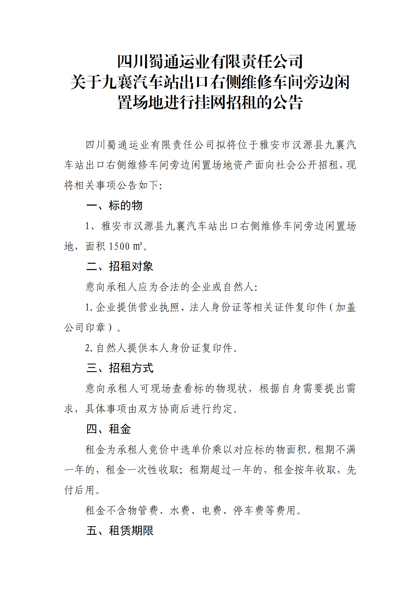 四川蜀通运业有限责任公司 关于九襄汽车站出口右侧维修车间旁边闲置场地进行挂网招租的公告