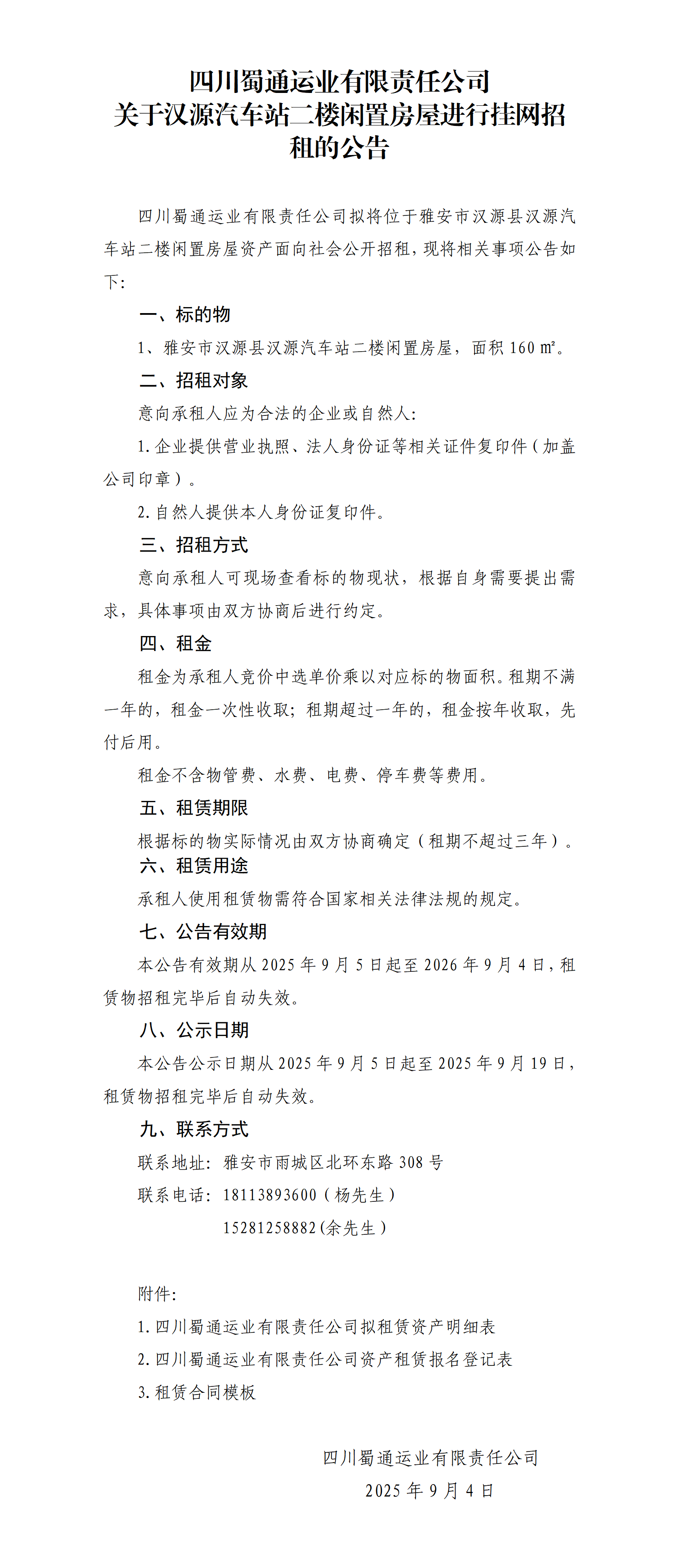 四川蜀通运业有限责任公司 关于汉源汽车站二楼闲置房屋进行挂网招租的公告